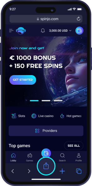 Gehen Sie zur Spinjo-Startseite und öffnen Sie das Menü Aktion, indem Sie auf das entsprechende Symbol tippen.