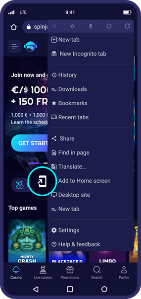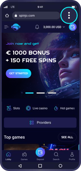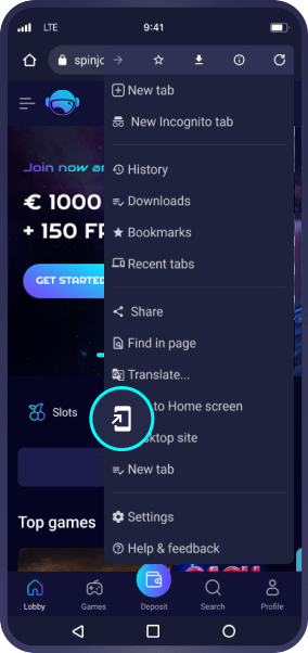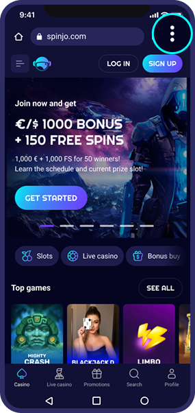 Gehen Sie auf die Spinjo Startseite und tippen Sie auf die drei Punkte, um das Browser-Menü zu öffnen